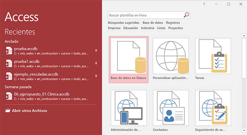 A la izquierda aparecen listadas las últimas bases de datos abiertas (Recientes). Haciendo clic sobre una de ellas se abrirá directamente.